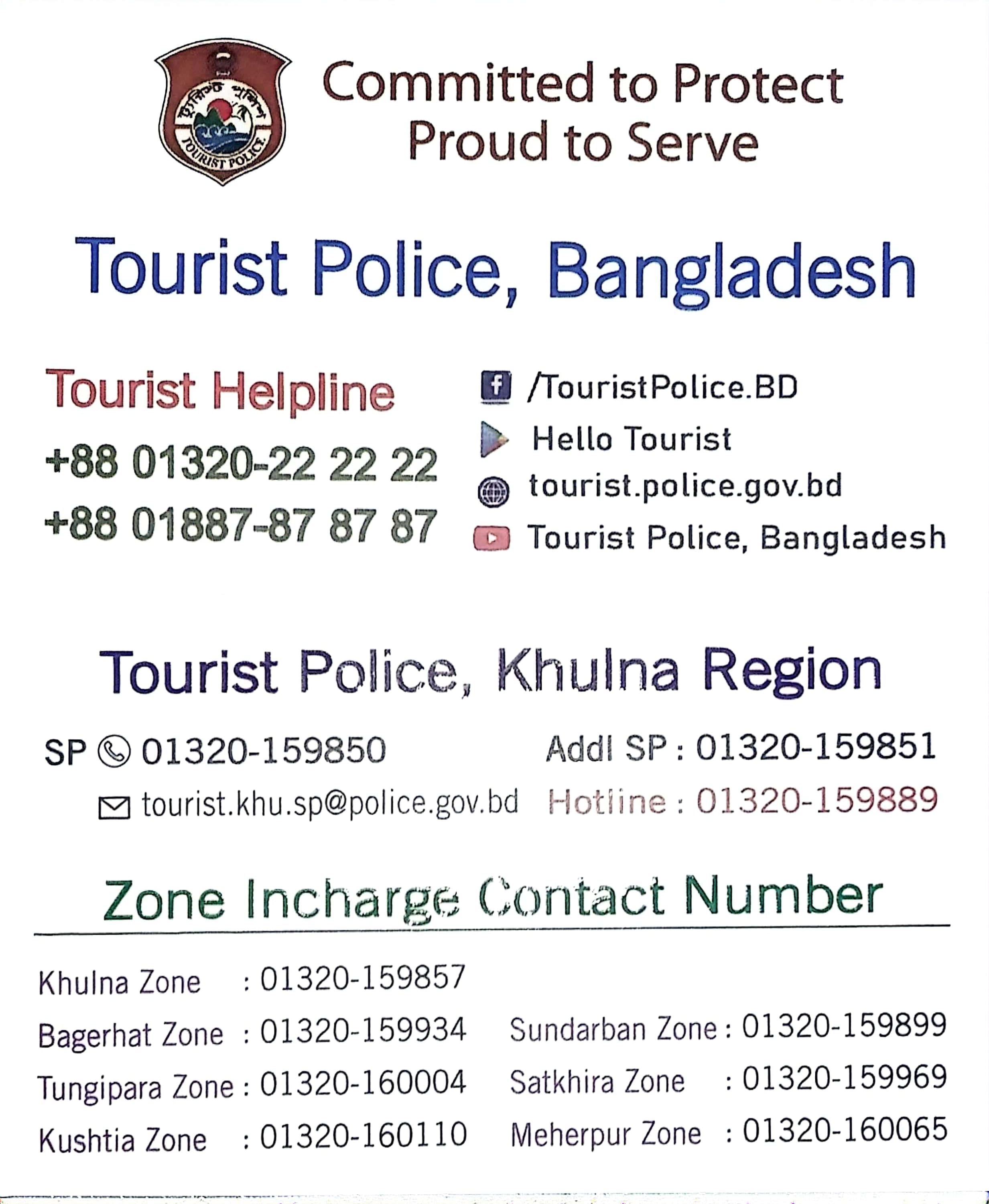 | ০২ | ট্যুরিস্ট পুলিশ, খুলনা রিজিয়ন,কমান্ড এন্ড কন্ট্রোল | +88 01320 159889 | tourist.khu.sp@police.gov.bd |